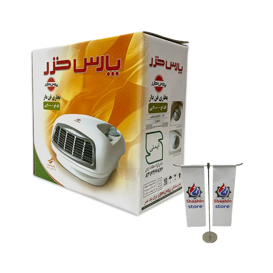 بخاری برقی فن دار رومیزی پارس خزر مجهز به دو کلید با چراغ نشانگر برای روشن نمودن المنتها در دو حالت 1000 وات و 2000 وات می باشد. برای حمل ساده این وسیله یک دست در پشت آن قرار دارد و سیم ها نیز در همان قسمت جمع می شوند. زیر بدنه محصول چهار عدد پایه کوچک برای ایستایی هرچه بهتر آن قرار دارد. بدنه این محصول از پلاستک فشرده و مقاوم در برابر حرارت است.