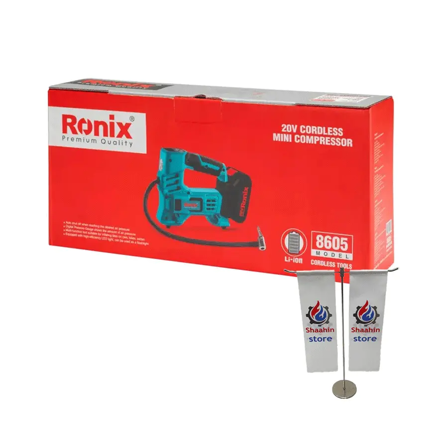 مینی کمپرسور شارژی رونیکس مدل 8605 ابزاری چن کاره و کاربردی برای مصارف خانگی، سفر و کمپینگ است. این دستگاه پر قدرت 20 ولتی از برند محبوب رونیکس با استفاده از موتور و پمپ پر بازده، توانایی تولید فشار حداکثر 150 PSI که معادل 10.35 بار یا 1035 کیلو پاسکال است را دارد و می تواند هوا را با حداکثر جریان 16 لیتر در دقیقه خارج کند.