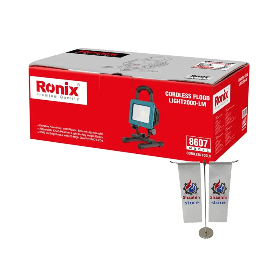 نورافکن شارژی رونیکس مدل 8607 یک منبع نور حرفه ای و قدرتمند برای روشن کردن فضاهای باز و محیط های وسیع است. این پروژکتور شارژی 20 ولت رونیکس با استفاده از 60 عدد LED SMD2835 با کیفیت، توان روشن سازی 2000 لومن را دارد و محیط های تاریک را به صورت یکنواخت و قدرتمند روشن می شکند